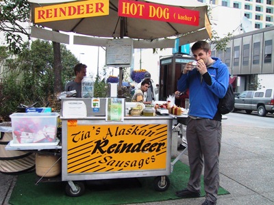 | Our first taste of Alaskan food in Anchorage – reindeer hot dogs. |
