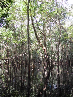 | The next morning we paddled in canoes through the floating forests. The black water is strikingly beautiful and reflects what is above like a mirror. It can be hard to tell where the water starts. |