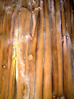 | Water drips from the stalactites forming stalagmites below. Eventually they will touch and join. |