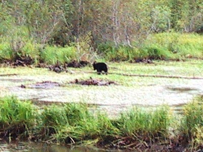 | We saw many black bears. At this time of year they are attracted to the roadside to eat the Autumn berries which grow along the side of the road where there is more light. Fortunately they were usually scared of us and left as we came past like this one. |