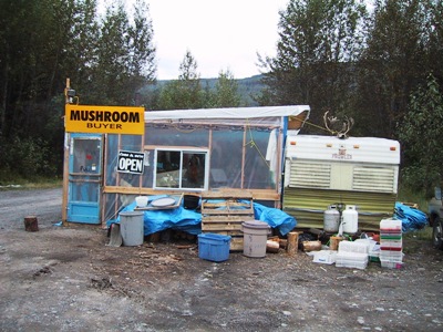 | South of Meziadin Junction we came across a mushroom camp. Pine mushrooms are highly sought after in Japan and grow only in certain conditions found here. They can fetch large amounts in Japan depending on the mushrooms' relative abundance or scarcity worldwide. If you have some spare time you can earn $25 per pound for trudging through the forests picking these mushrooms. The buyers drive them overnight to Vancouver where they are packaged and flown the following morning to Japan. |