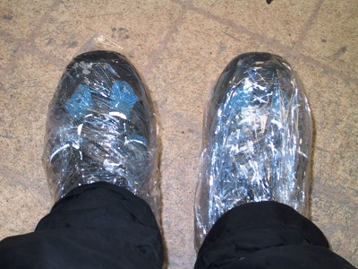 | In the mean time we tried various methods to keep our shoes dry, including cling film. We found that plastic shopping bags work best. |