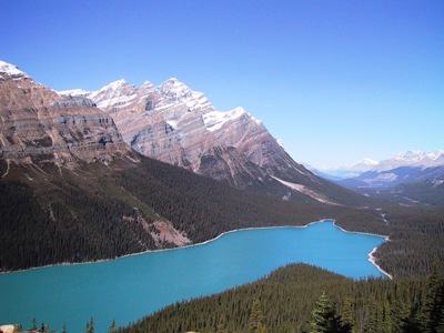 | View of Peyto Lake and its fabulous turquoise water. The colour comes from fine mountain dust created by the grinding of rock by glaciers further upstream. The dust, suspended in the water, affects the way that light is reflected. |