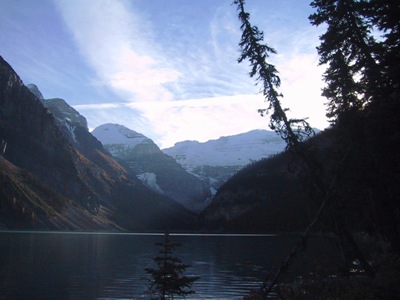 | Lake Louise, probably the most famous of the lakes in this area, has a dramatic backdrop of snow capped mountains. |