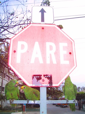 | These parrots belonged to the owners of a street side café but like to spend most of the day on this stop sign. |