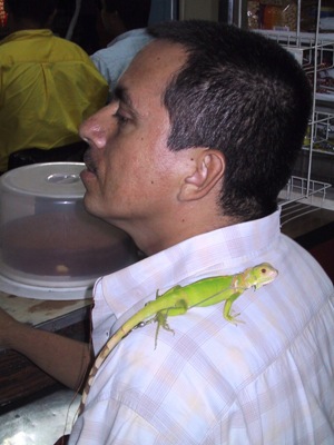 | This shop assistant took his pet iguana everywhere, even to work with him. |