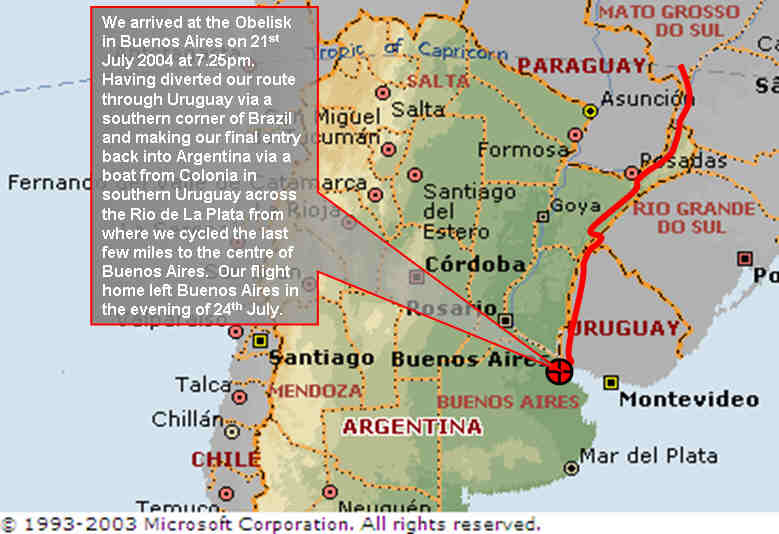 | General Notes: | The final leg of our journey from the Brazil/Argentina border to Buenos Aires was less than smooth with poor road conditions initially in Argentina together with strong headwinds and low temperatures. Things improved considerably having crossed into Uruguay with traffic levels much reduced but headwinds making for extremely long days of cycling well into the night. We calculated a worst case scenario and figured that in order to guarantee achieving our goal we needed to reach 80 miles each day which would often take us in excess of 12 hours on the saddle. In the end the winds gave us some small periods of respite where we managed make significant progress with our final arrival in Buenos Aires leaving three clear days before our flight. Finding accommodation and boxes for our bikes was relatively easy in Buenos Aires where the locals are familiar with the needs of travellers. We were able to spend our last few days enjoying the luxuries of the amazing food, wine and atmosphere that the City offers. The completion of the journey on time and without major instance was incredibly exciting but obviously sad for us in that it spelt the end of a long adventure and the way of life that we had settled into over the last year. |
