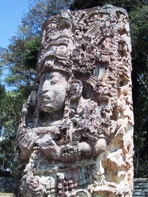 | Copan is famous for its intricately carved stone stelae which depict the Kingdom's rulers. This one is King 18 Rabbit who ruled between 695 and 738 AD. |