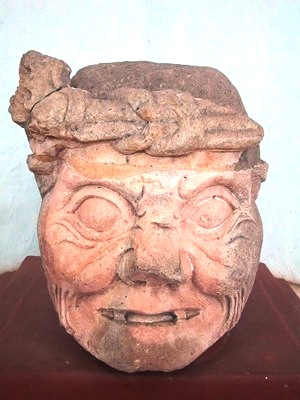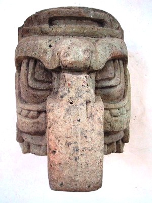 | The people of Copan thought of the world as the body of a crocodile floating on water, its four corners held up by gods known as Pauahtuns, one of whom is depicted in this sculpture. |