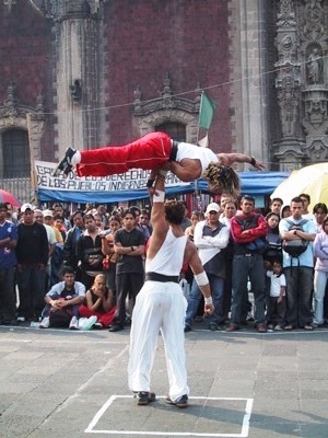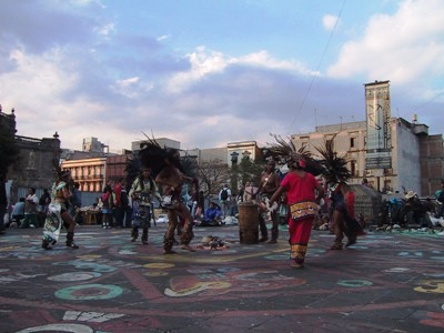 | The Zocalo, the main square in Mexico City is a focus of activity for street performers. Here rhythmical Aztec dances are being performed to the sound of drums and the rattles of a kind of leg warmer made of shells. |