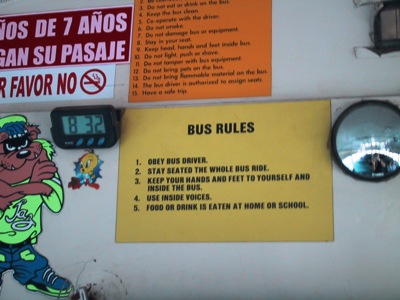 | Leaving our bikes in the hotel we headed out around the island by bus. We were puzzled by Bus Rule number 4 which stipulated that we must ‘use inside voices’. |