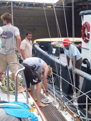 | Each boat passing through the Canal requires at least four line handlers. The lines are used to maintain the boat’s position whilst water levels change within the locks and to stabilise smaller boats when larger ships turn their propellers. |