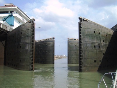 | These are the final gates of Miraflores Locks opening the way to Panama City and the Pacific Ocean. |