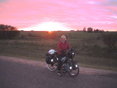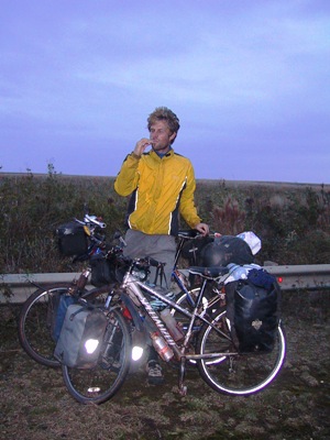 | As the wind was slowing us down, the last week involved very long days with short breaks for meals at the side of the road. We resolved never to stop pedalling until our Speedos showed at least 80 miles for the day. On very windy days we put in 12 hours of cycling. |