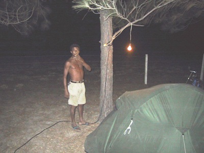 | When we asked if we could camp on this man’s farm, he rigged us up a night light beside our tent. |