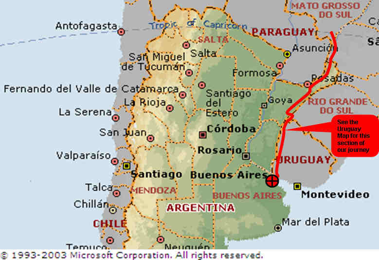 We entered Argentina at Iguazu Falls and continued south. The route took us down the thin peninsula of land belonging to Argentina that lies between Paraguay and Brazil. Initially we kept to the west close to Paraguay before heading more south-easterly at the town of Posadas. Once we were close to the Brazilian border again, traffic increased and the road shoulders that had initially made life in Argentina more pleasant disappeared. After many close shaves with trucks we sat down and studied our maps for alternative routes. We spoke to some motorcyclists in a service station who advised us that Uruguay's roads are very bad and slow. They thought we should stay in Argentina for this reason but the idea of potholed roads which trucks might avoid gave us hope of more tranquil cycling. With this thought in mind we made a decision to head back into Brazil crossing the border and headed through the Brazilian border smuggler's city of Uruguaiana so as to pick up a road heading south into Uruguay. This turned out to be an excellent decision with the roads far exceeding our expectations. The Country had a friendly and safe atmosphere which helped in allowing us to cycle into the night and camp by the roadside with little difficulty.