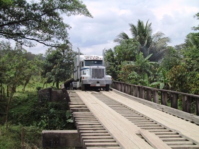 | Once in Honduras the road deteriorates in quality becoming unpaved with rickety bridges. |