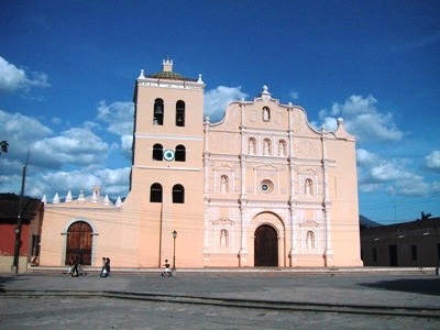 The church of Los Dolores in Tegus. There is a mixture of Catholic and indigenous symbols displayed on the façade including Passion of Christ and the Sun.