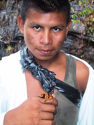 | Our guide, Eduardo, is an indigenous Venezuelan. Traditionally they used these frogs to make poison to use on arrowheads and darts for hunting. He was quick to spot one on route to Sapo Falls. |